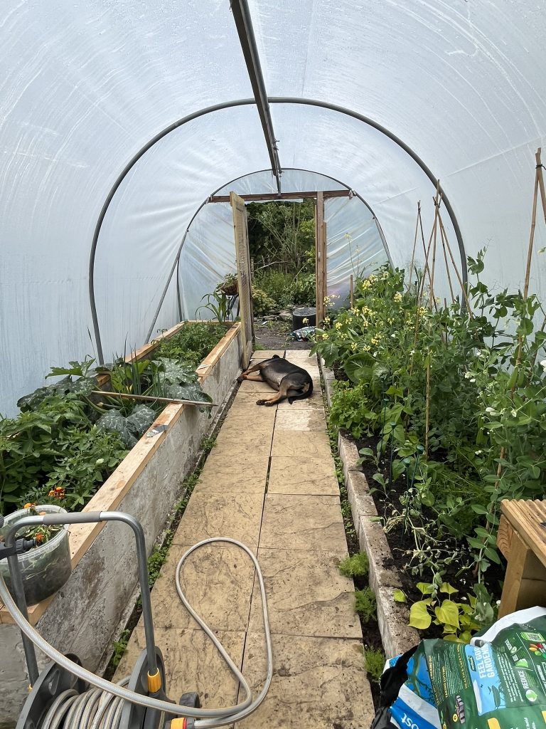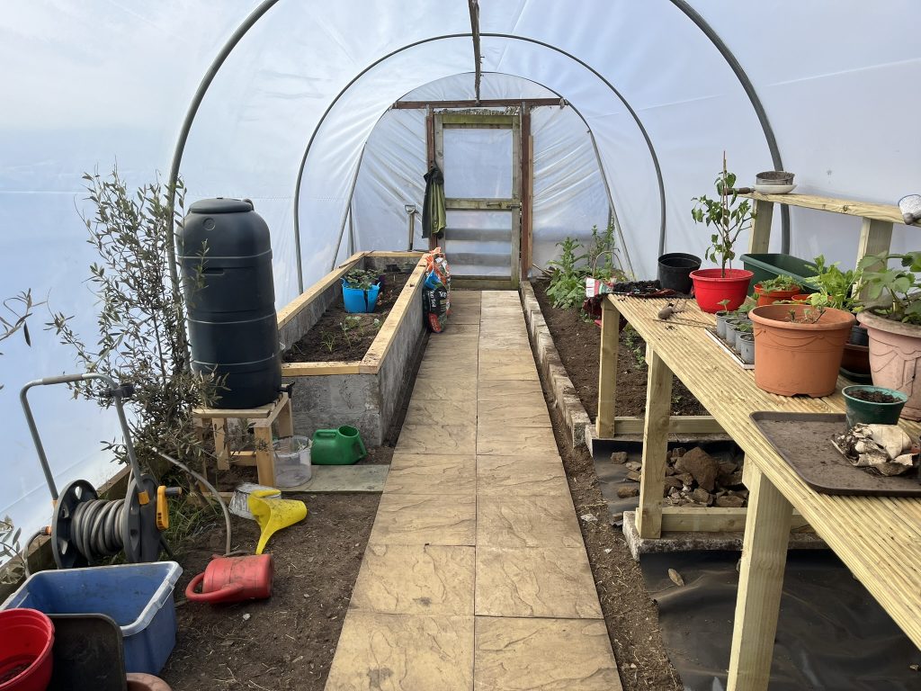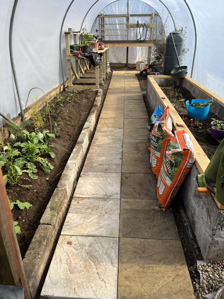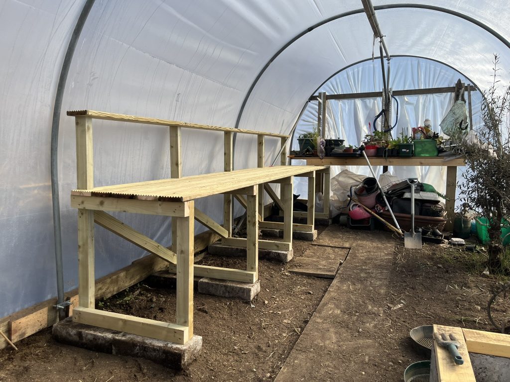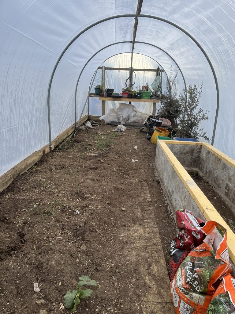 Time for a polytunnel revamp. Start by gutting the space Dig out the rotting base boards Put in new base boards Build a raised bed Remove old cover and re-tape poles New cover (to be tightened later) Build staging Revamp the path Start growing stuff